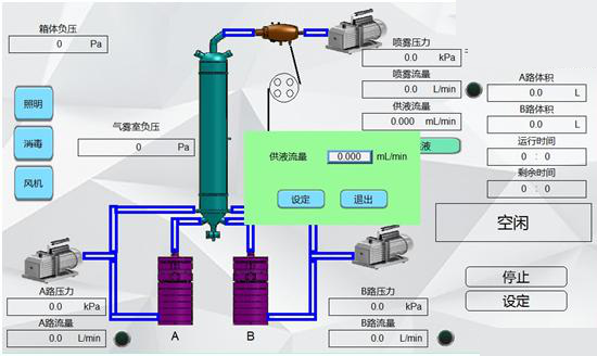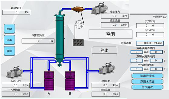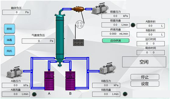 在試管中加入適量70%酒精,接入系統(tǒng)管路中,進(jìn)入“系統(tǒng)消毒”模式,設(shè)定蠕動(dòng)泵流量、噴霧流量及時(shí)間后,開始消毒。