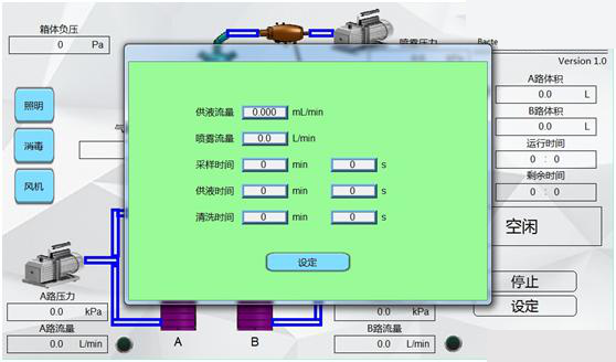 點(diǎn)擊開始試驗(yàn)選項(xiàng),進(jìn)入氣路平衡,實(shí)驗(yàn)人員觀察各個(gè)氣路運(yùn)轉(zhuǎn)是否正常,氣路平衡的目的就是在正式試驗(yàn)前使各項(xiàng)數(shù)據(jù)進(jìn)入預(yù)設(shè)工作參數(shù),流量穩(wěn)定,氣霧室壓力穩(wěn)定在(-90~-120)Pa之間。如果運(yùn)轉(zhuǎn)正常,顯示綠色字體,如有異常情況,顯示紅色字體。(配氣路平衡運(yùn)行軟件界面圖)
